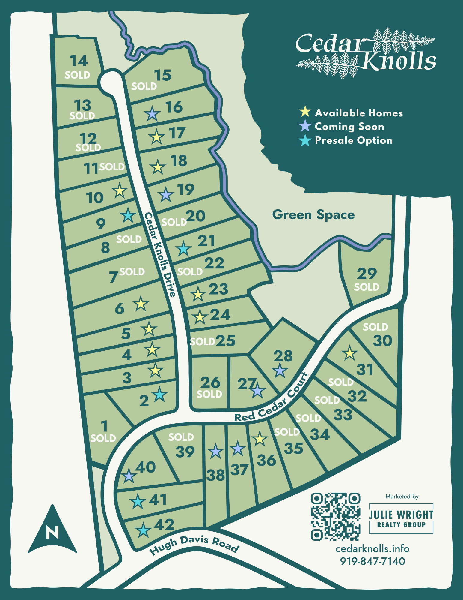 Cedar Knolls is the perfect place to build your dream home in a peaceful rural setting. Our neighborhood offers a sanctuary where you can escape the hustle and bustle of the city With new construction homes by our local custom builders, you can rest assured that your home will be built to the highest standards of quality and craftsmanship. Located in Youngsville, North Carolina, you will experience the charm of small town living combined with the convenience of being close to the city. Contact us today to learn more about the opportunities waiting for you at Cedar Knolls